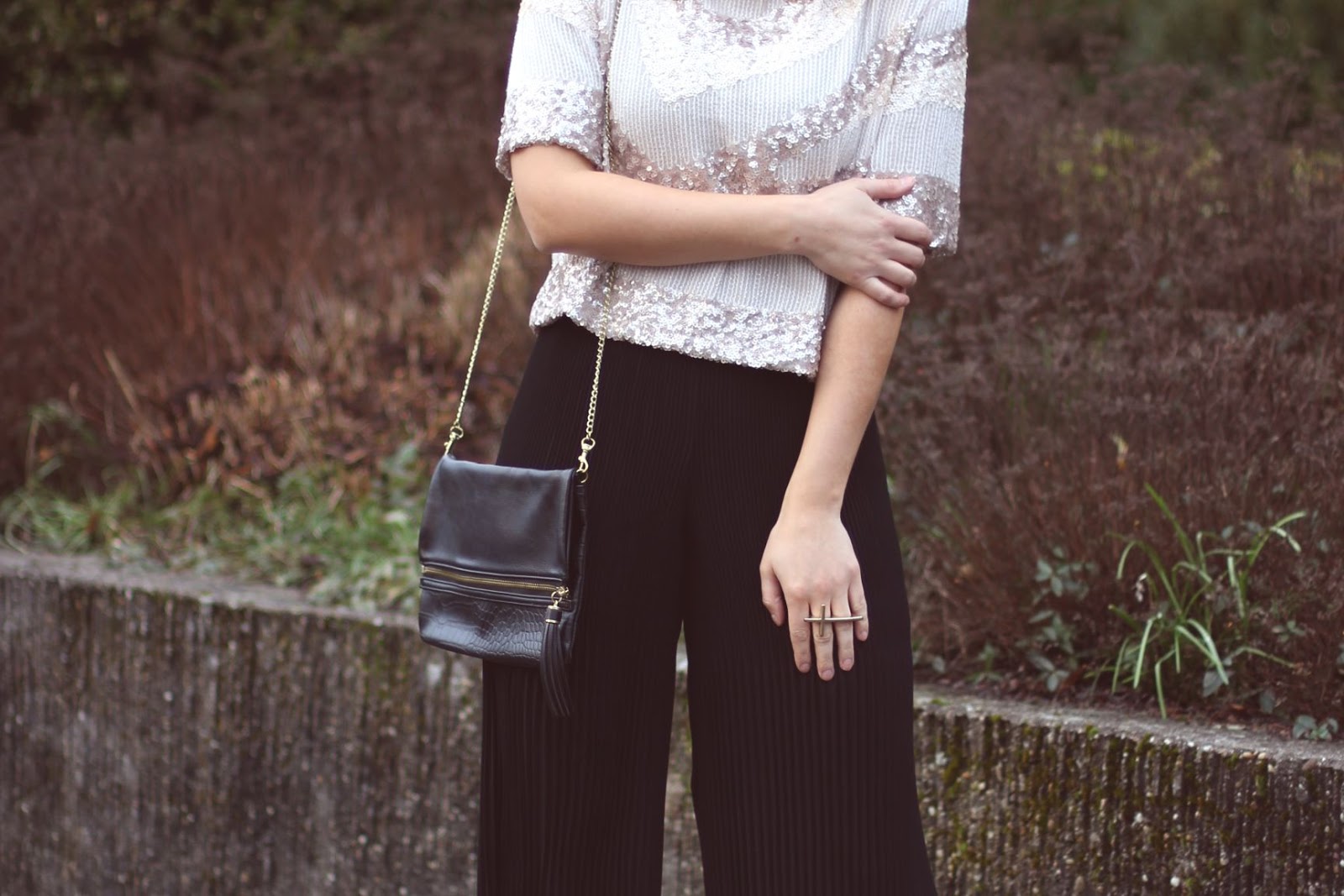 Heute gibt es das letzte Outfit meiner kleinen Reihe. Wenn ihr die anderen beiden Outfits noch nicht gesehen habt, findet ihr hier Part 1 und Part 2. Ich dachte jetzt, wo es auf die festlichen Tage, Weihnachtsfeiern und sonstigen Veranstaltungen zugeht, darf es es auch ruhig so festlich aussehen. Das mit Pailletten bestickte Oberteil schien mir dafür besonders geeignet. Die Intention dabei wie ein Weihnachtsbaum zu glänzen hatte ich dabei nicht, aber durch die schwarze Culotte wird das ganze ohnehin wieder etwas abgeschwächt.